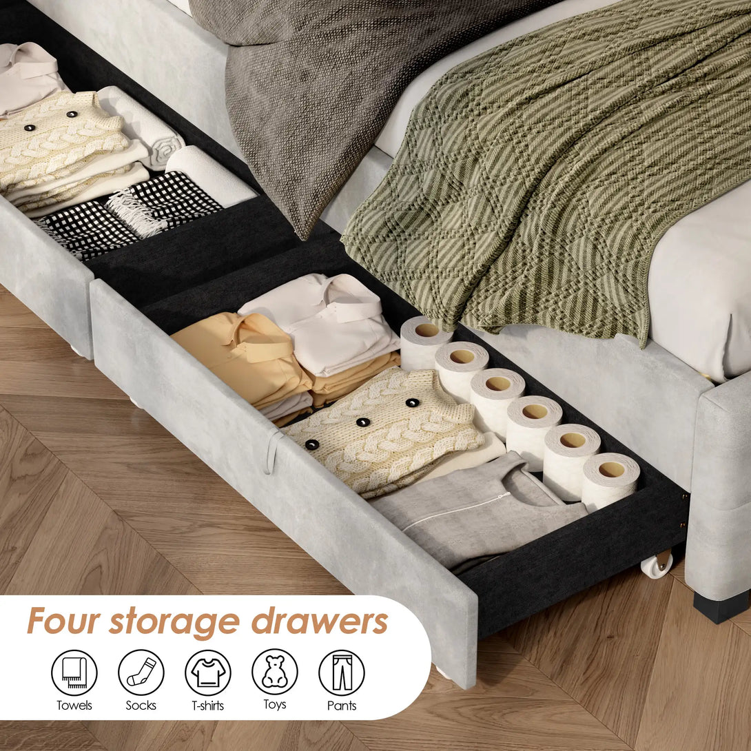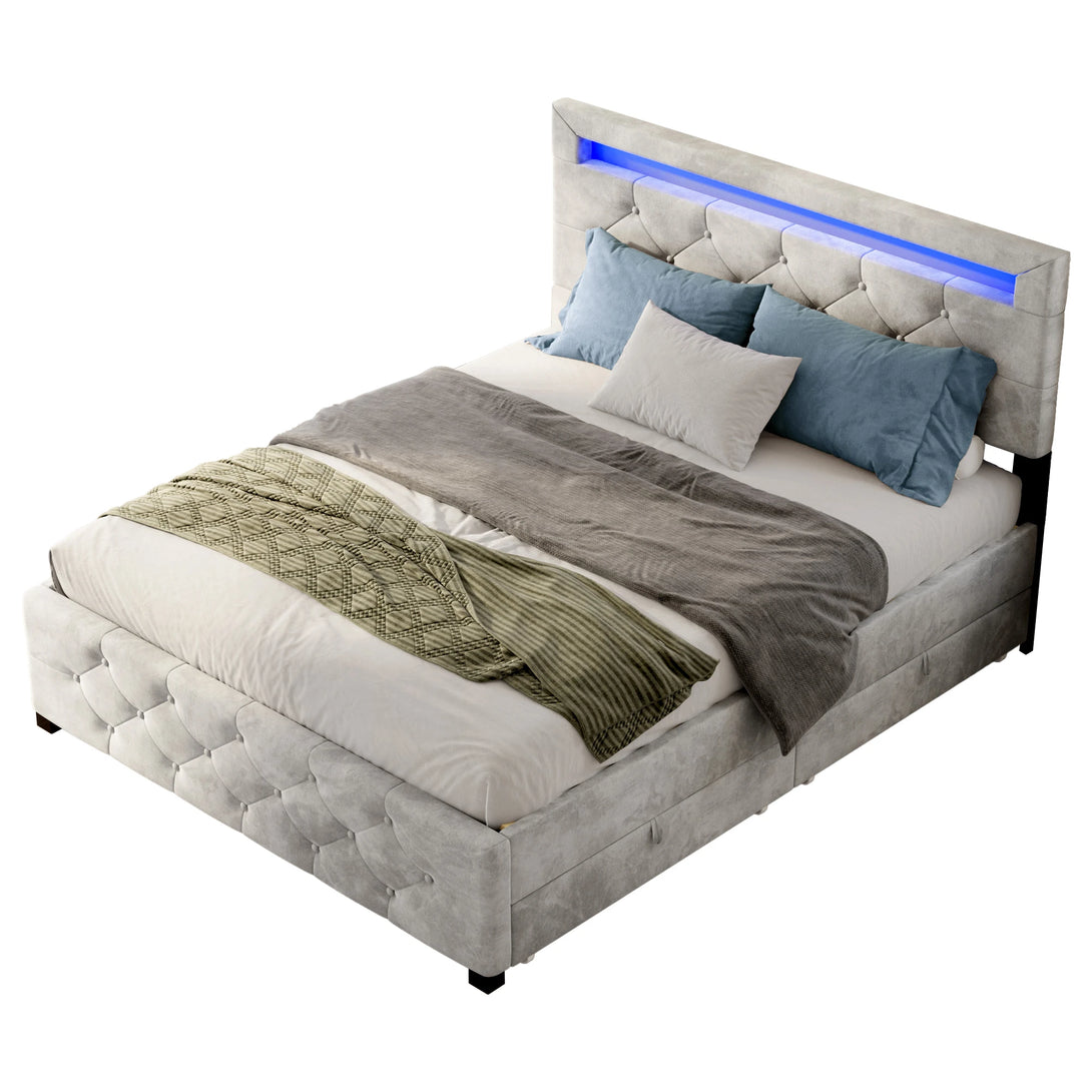 Modern queen-size upholstered platform bed in grey velvet with LED-lit headboard, dual-height adjustment, and four spacious drawers. Built with sturdy metal frame, solid wood slats, and reinforced legs, it supports up to 800 lbs while offering comfort, storage, and style—no box spring required.