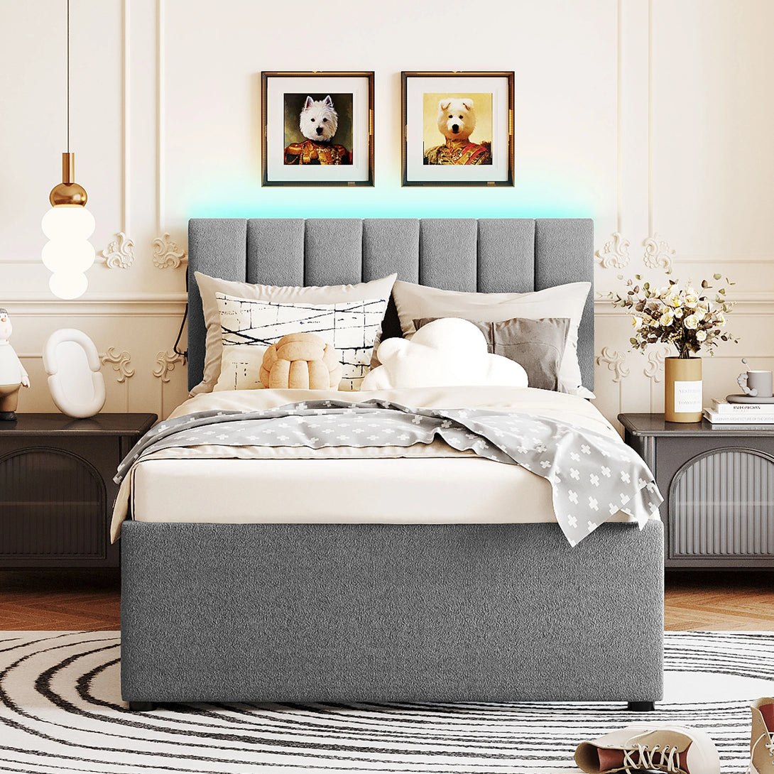 Upholstered Bed with Trundle – Features a striped headboard for a classic look, trundle for sleepovers, and smart LED lights via remote/APP. Built with sturdy particle board & MDF. Size: 76"L x 41.3"W x 40.2"H. Mattress not included.