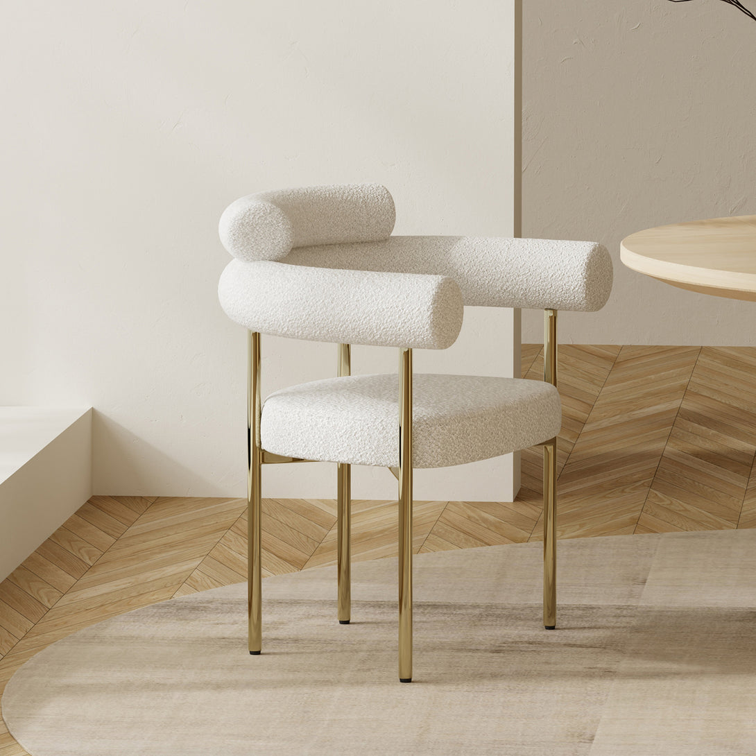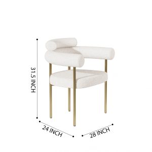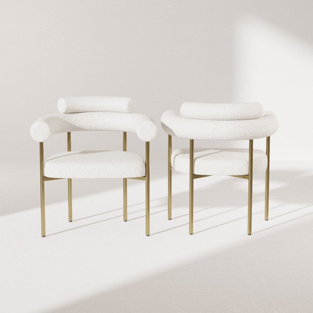 This modern dining chair combines sleek design with comfort. Featuring a fabric seat and backrest for a cozy feel, it’s accented with soft round fabric armrest ends. The sturdy metal frame ensures durability, while its minimalist style fits dining rooms, studies, or bedrooms, adding contemporary charm.