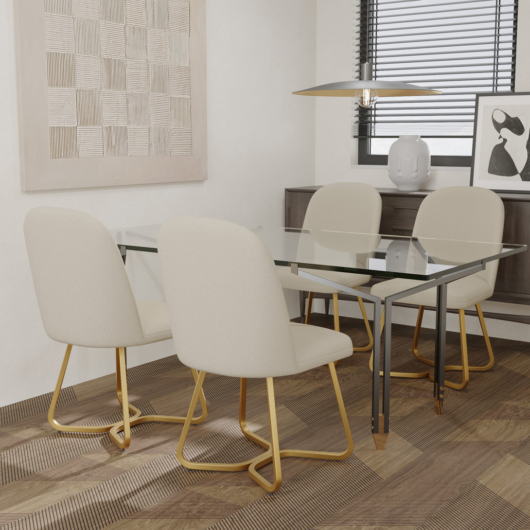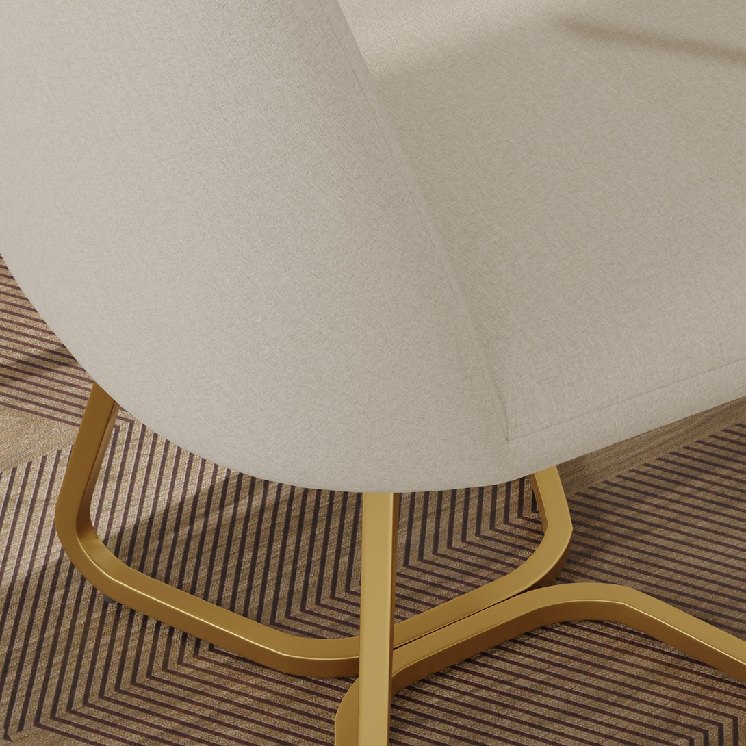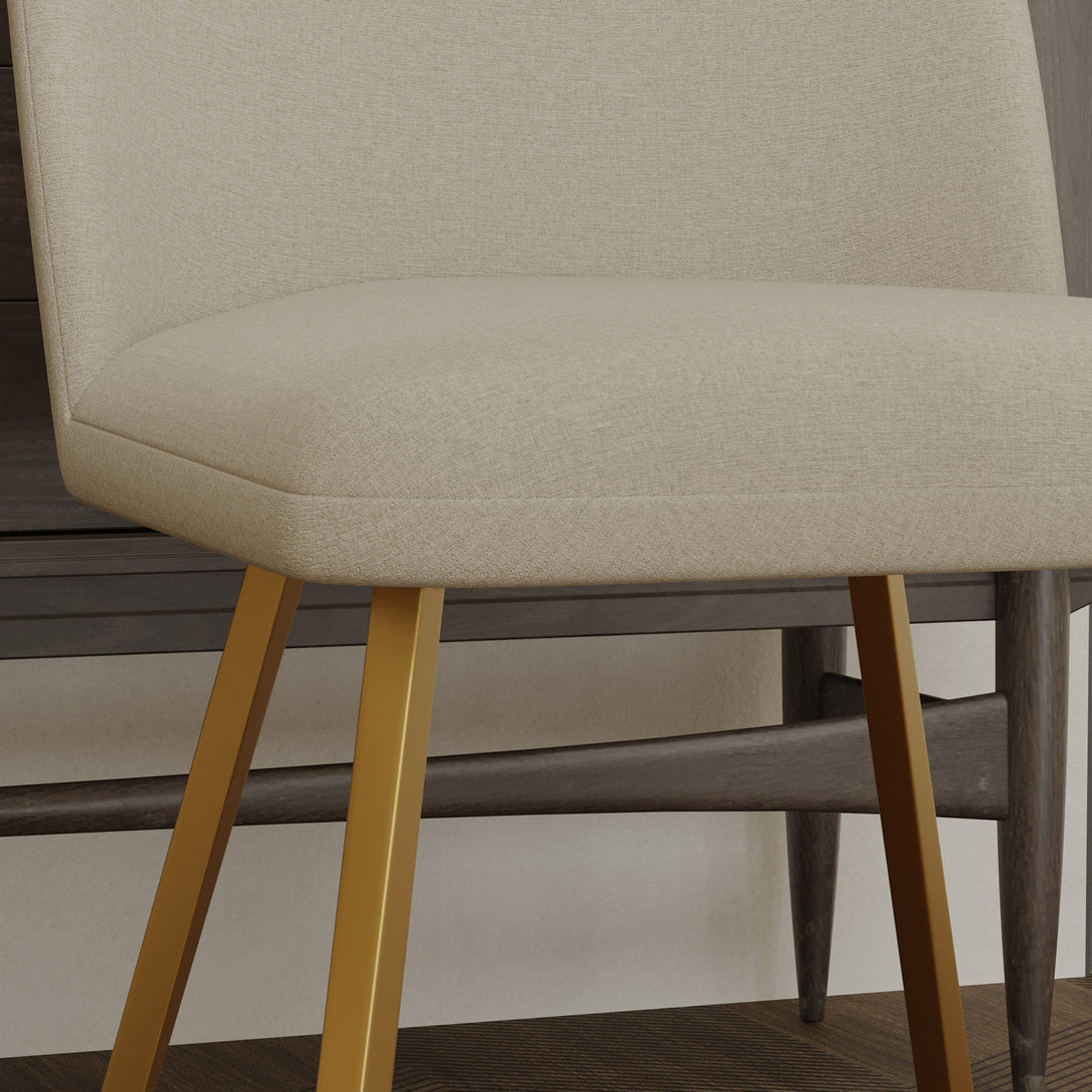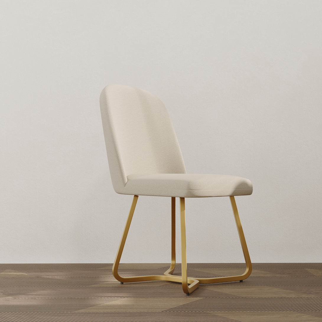 This modern dining chair combines simplicity and elegance with a fabric seat and backrest for comfort. The gold-colored metal frame features a unique crossed design, offering stability and a contemporary artistic touch. Perfect for dining rooms, living rooms, or studies, it adds style and sophistication to any space.