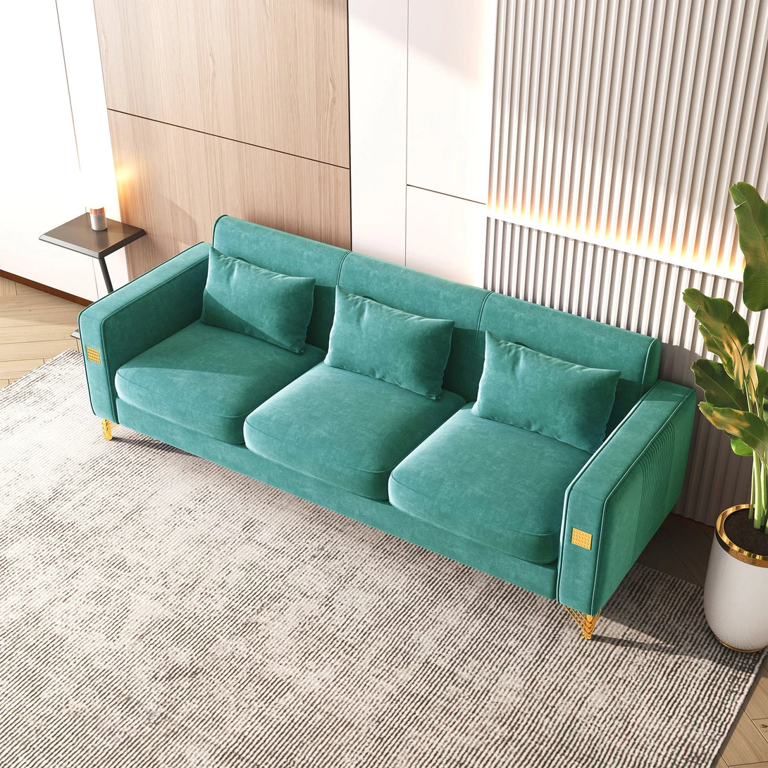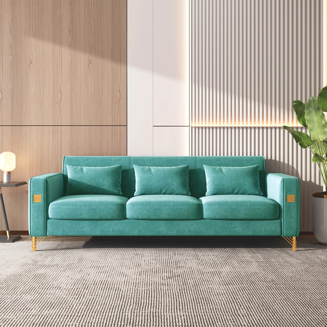 Modern velvet sofa with sleek gold legs, solid wood frame, and plush high-density foam with pocket springs. Available in vibrant colors, it blends comfort, durability, and elegance—perfect for any living space.