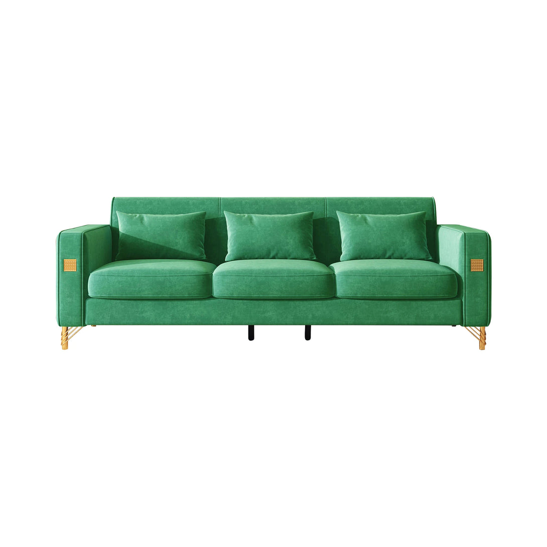 Modern velvet sofa with sleek gold legs, solid wood frame, and plush high-density foam with pocket springs. Available in vibrant colors, it blends comfort, durability, and elegance—perfect for any living space.