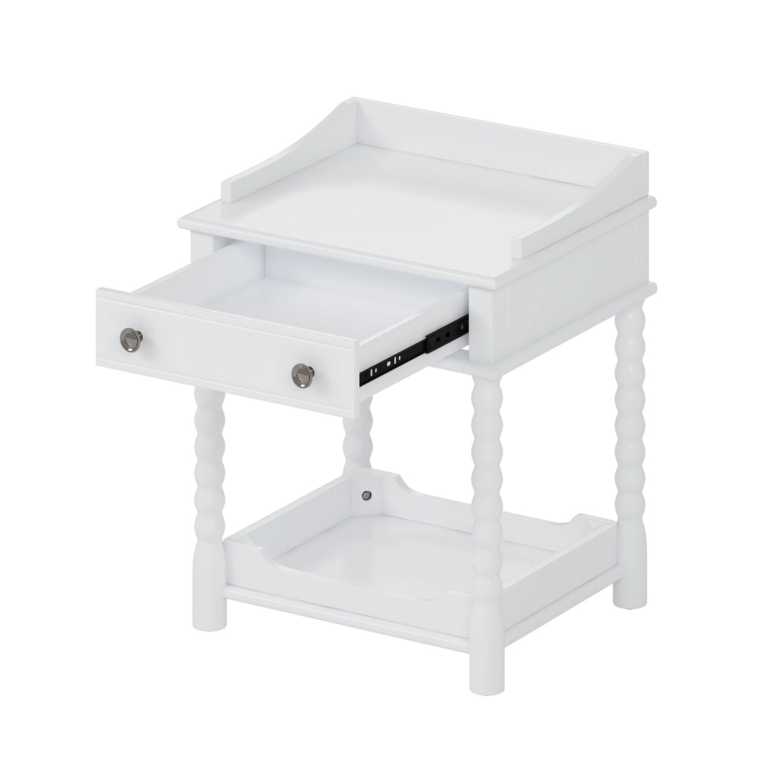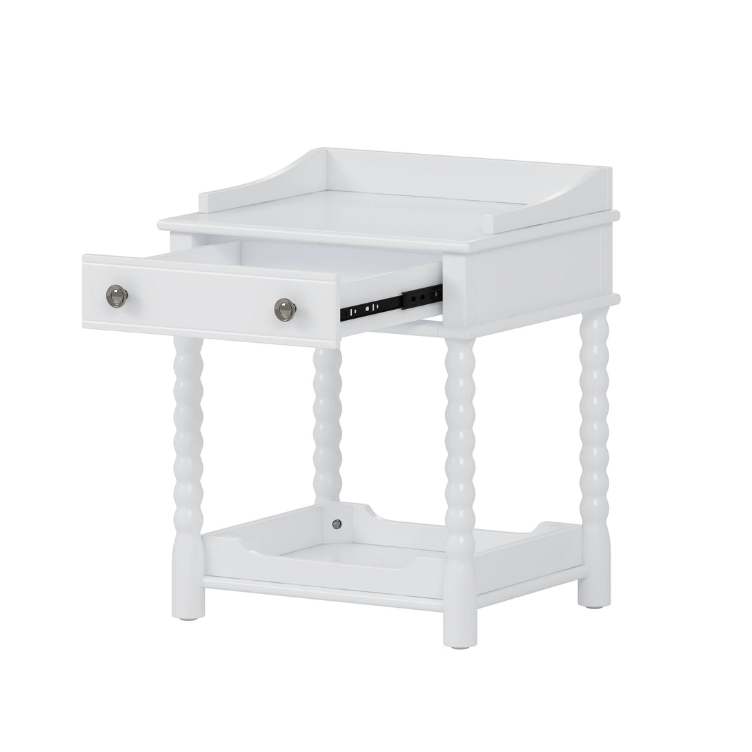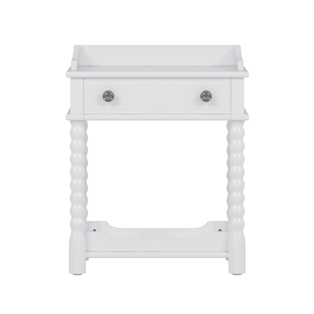 This bedside table features a vintage-inspired silhouette with turned legs, adding timeless character to your bedroom.
