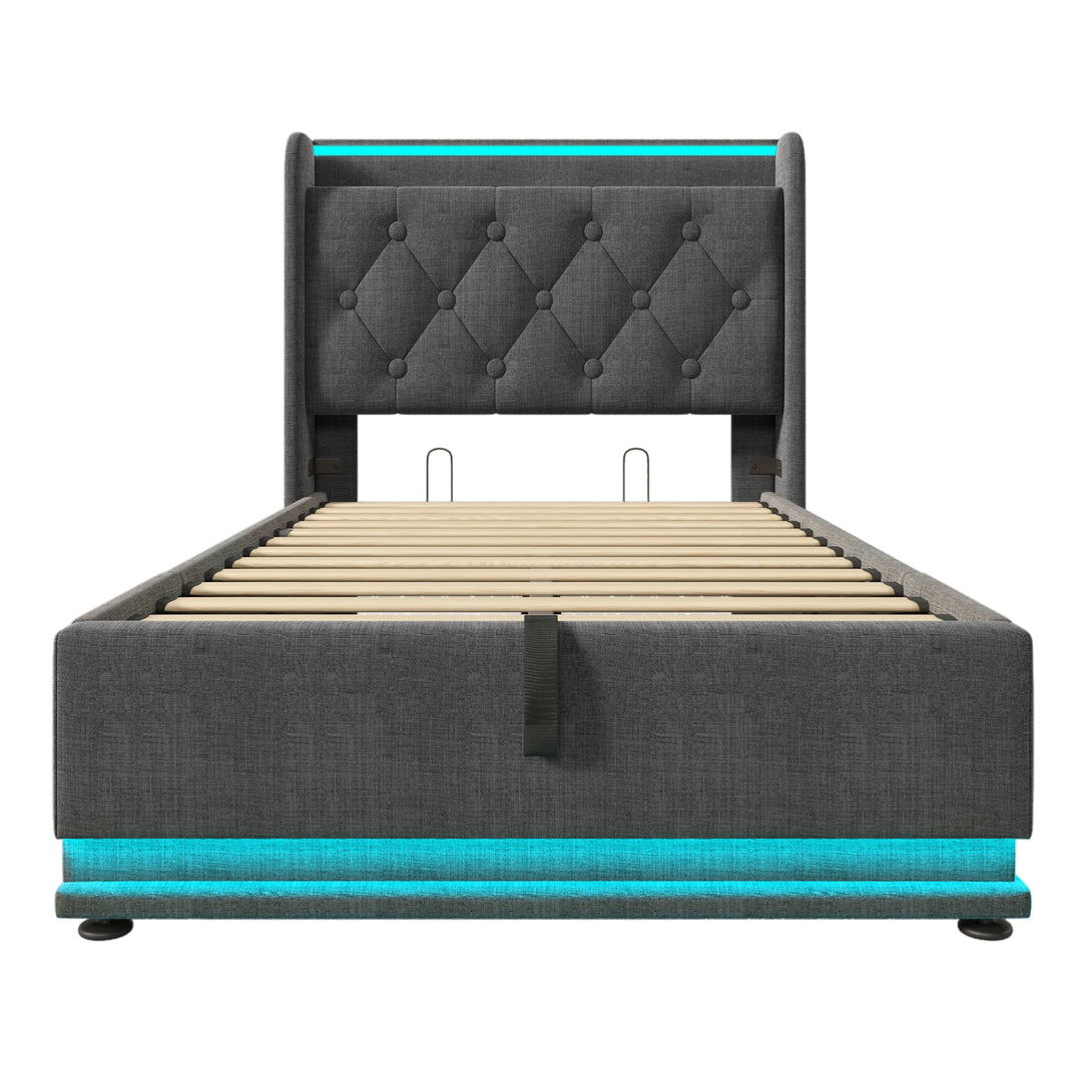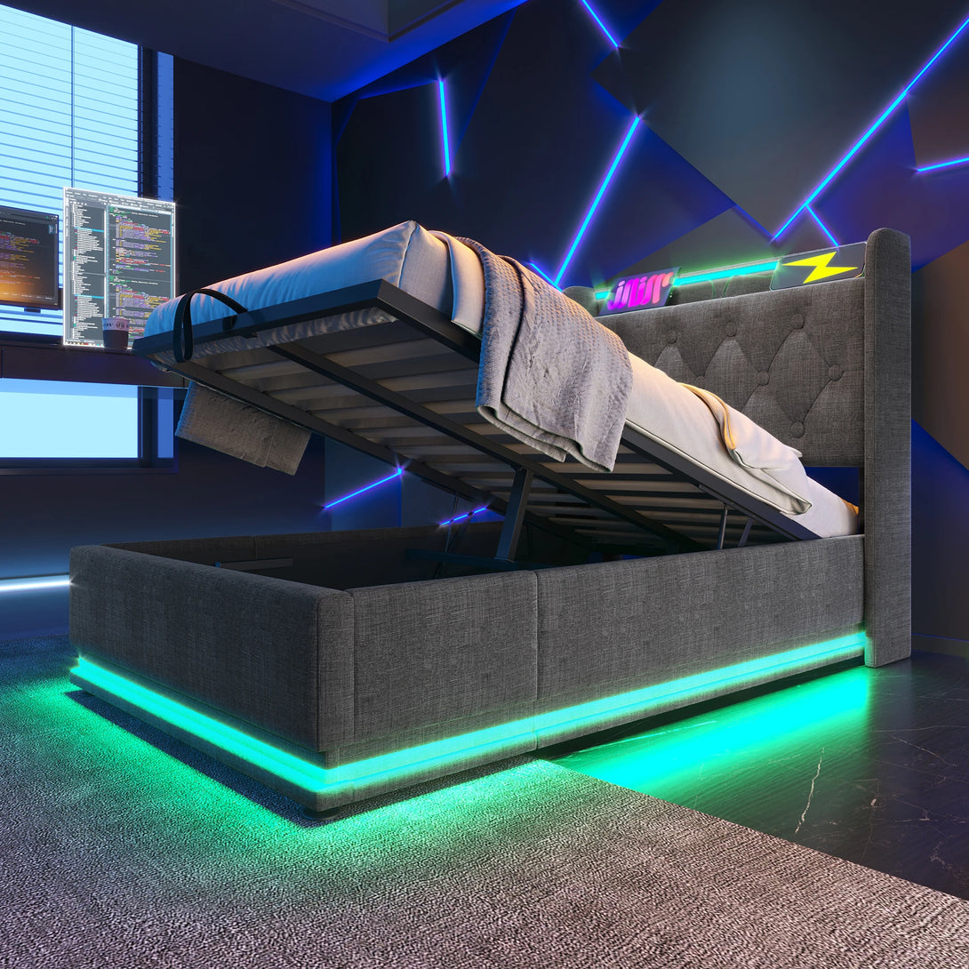 LED Bed with Storage & USB – 360° LED lights with remote/APP/music sync create a cozy vibe. Tufted headboard with USB & Type-C ports adds comfort & convenience. Hydraulic lift offers large hidden storage. Strong iron frame, noiseless slats & stopper bars ensure stability & restful sleep.