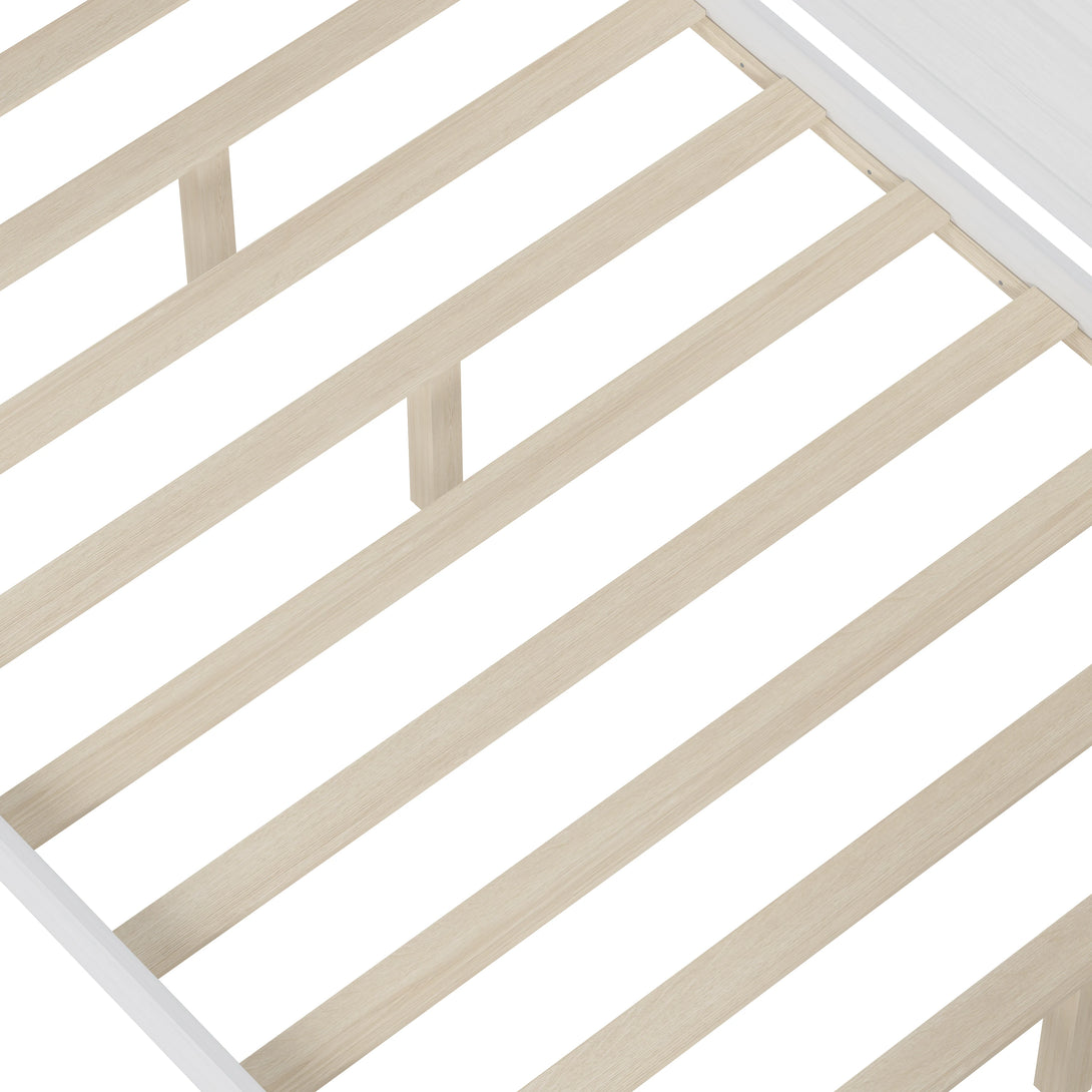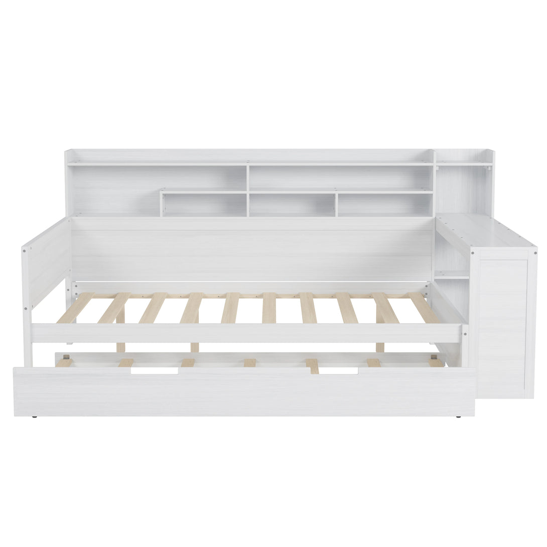 Multifunctional daybed with pull-out trundle offers extra sleeping space without taking up room. A built-in desk at the foot provides a workspace for study or reading. Side shelves add storage for books or décor. Made of MDF, plywood, and pine, the frame is sturdy and durable. Size: 91.3"L x 69.9"W x 44.9"H.