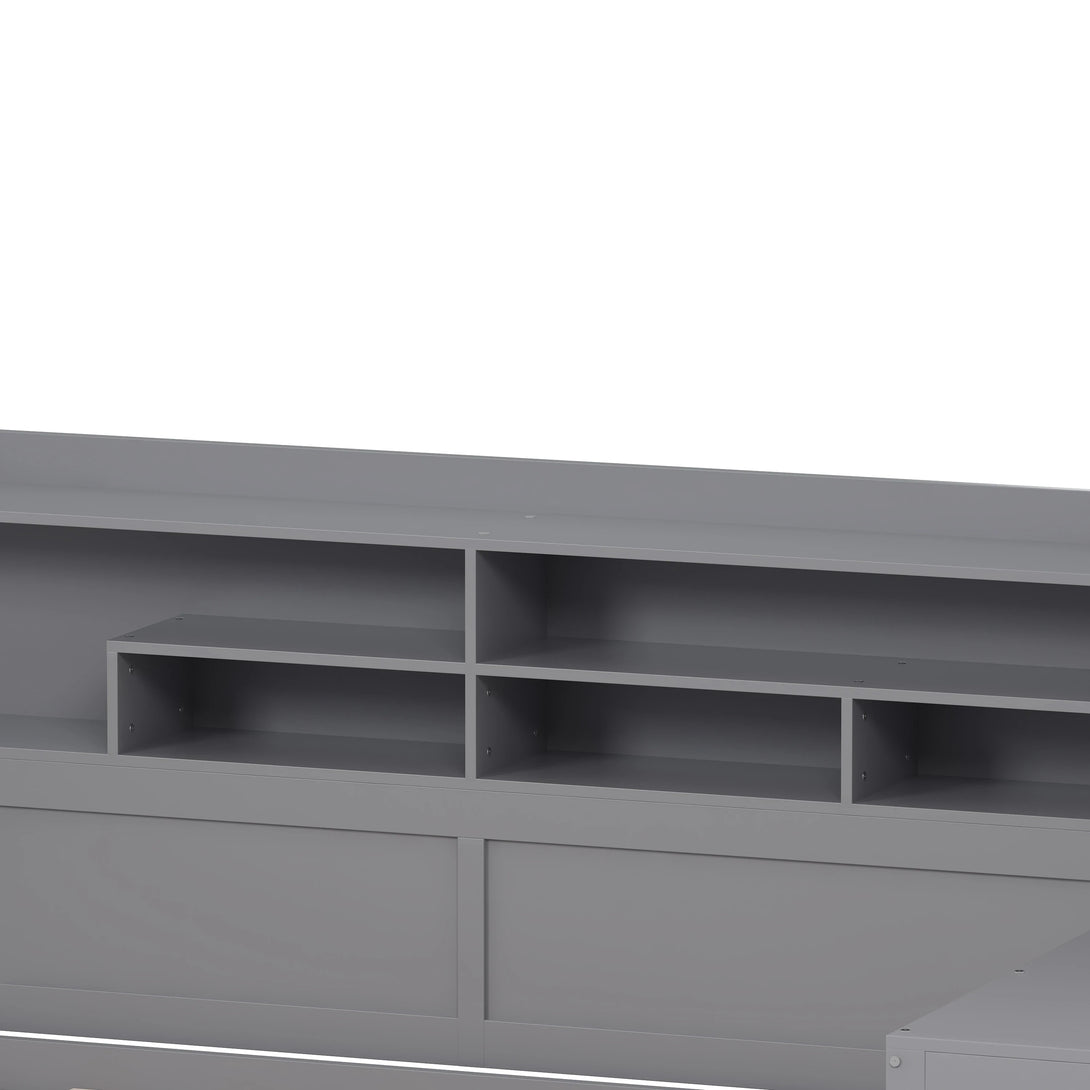 Multifunctional daybed with pull-out trundle offers extra sleeping space without taking up room. A built-in desk at the foot provides a workspace for study or reading. Side shelves add storage for books or décor. Made of MDF, plywood, and pine, the frame is sturdy and durable. Size: 91.3"L x 49.9"W x 44.9"H.