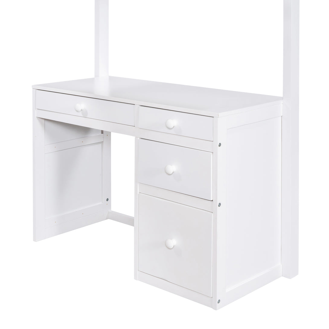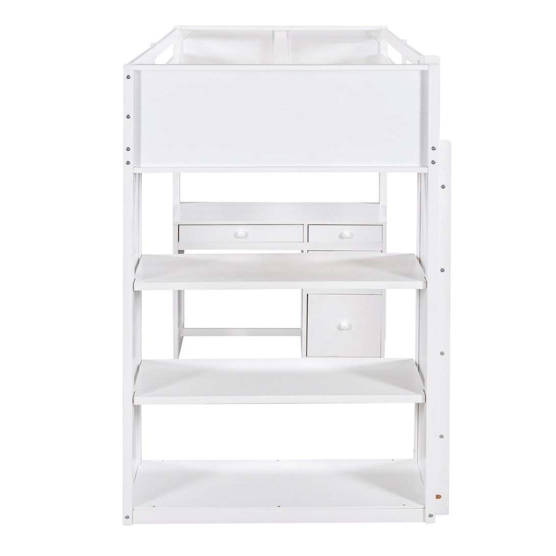 This multifunctional loft bed maximizes space with 3 shelves and 4 drawers for books and decor. Crafted from solid pine and commercial-grade MDF, it offers durability and safety with sturdy guardrails. Ideal for sleeping, studying, or play, it supports airflow around the mattress without a box spring. Available in 2 color schemes to match any bedroom. Easy assembly with included tools and instructions.